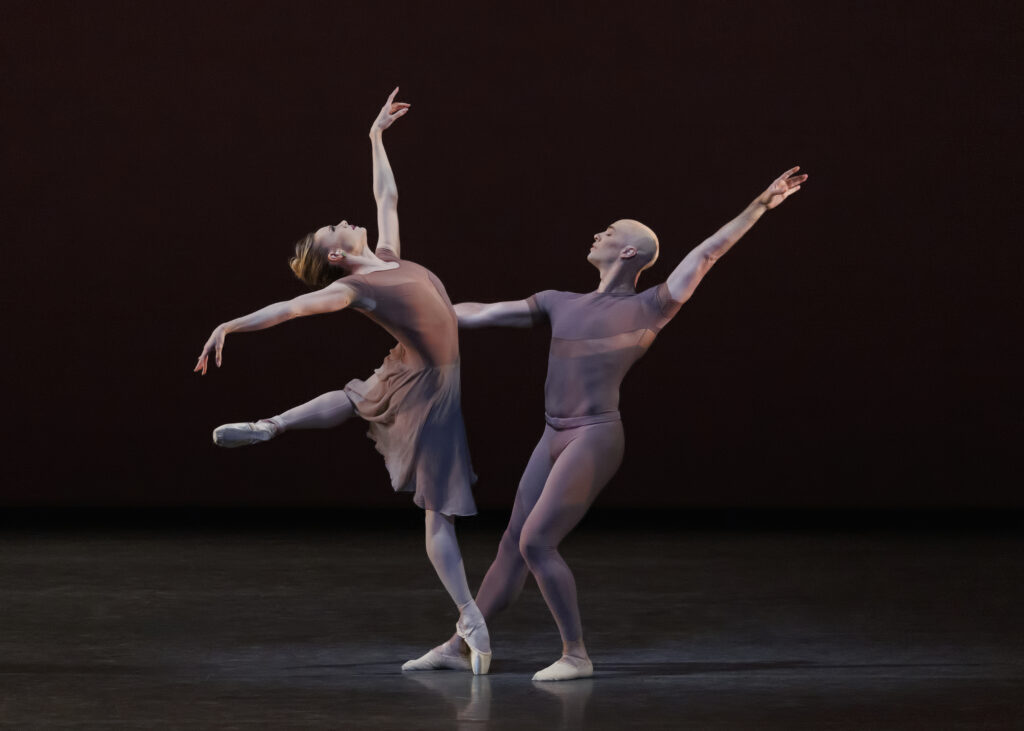 His 2014 ballet, Everywhere We Go, went everywhere more than once. Eternity passed, and another 22 minutes for good measure. The dancers would repeatedly lie down and hike one leg skyward like a bollard. This was charming the first time. They flung their arms outward as if warding off evil spirits. Ditto. One by one they collapsed in slow-mo while another dancer rushed over to ease their fall. In a post-COVID world, that imagery carried poignant new weight yet its reprise in the finale blunted the effect, signalling mere exhaustion. Adrian Danchig-Waring made poetry of even the plainest steps, his encounters with Dominika Afanasenkov shaping the ballet’s stirring emotional center.