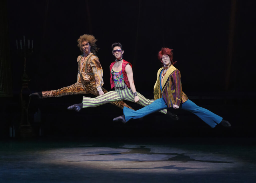 He proved an easy mark for three Swindlers – tailors in Hans Christian Andersen’s original story, here embodied by the brilliant David Gabriel, KJ Takahashi and Daniel Ulbricht, riotously outfitted in a glam-rock pastiche. With much bravura leaping and fervent gesticulation, they seduced the King into accepting a chic new garment allegedly endowed with a superpower that rendered it invisible to the stupid or incompetent.